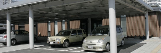 ■雨や雪を考慮し、屋根とロードヒーティングを設置した駐車場。